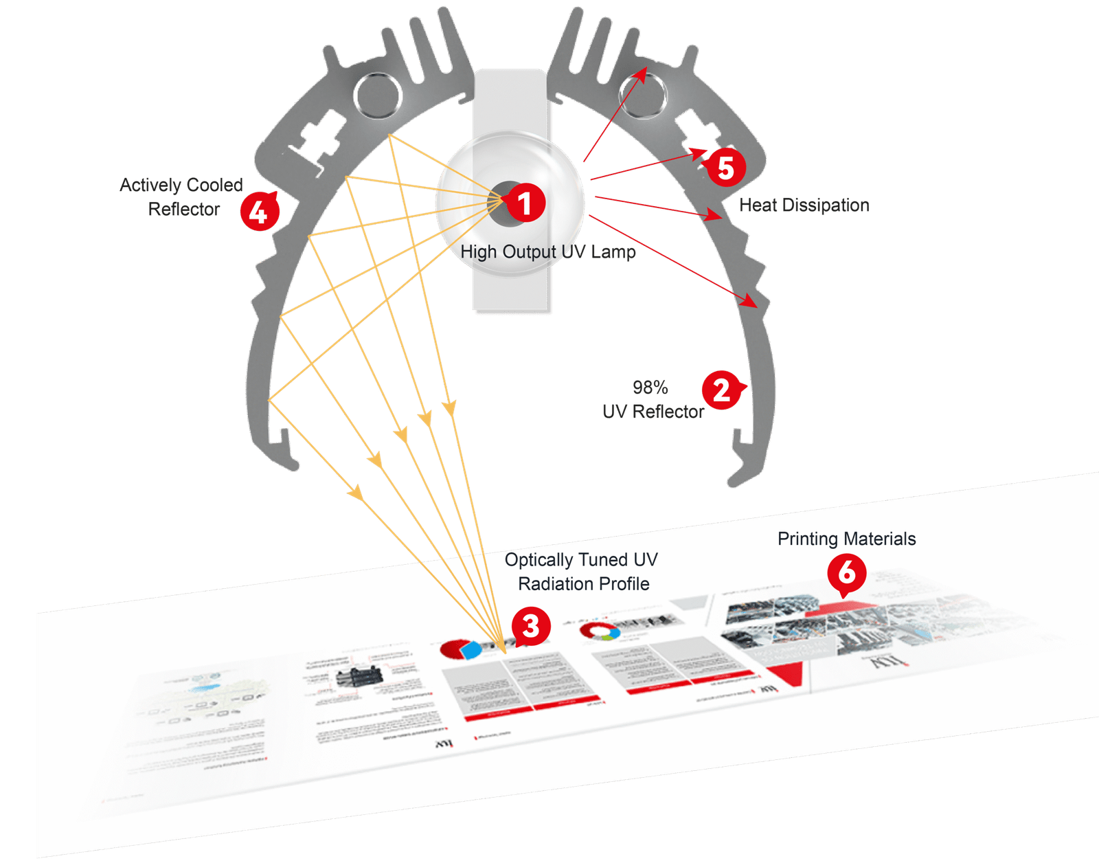 Les lampes au mercure d’IUV disposent d’un flux d’air avancé qui expulse efficacement la chaleur du boîtier de la lampe. Cela garantit le maintien de conditions de fonctionnement optimales pour une performance de durcissement équilibrée.